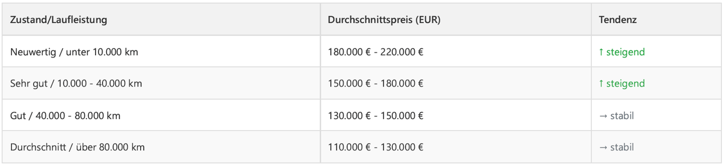 Aktuell (Stand 2025) liegt der Marktwert gut erhaltener Modelle bei ca. 350.000 € bis 400.000 €, mit weiter positiver Tendenz