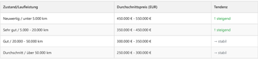 Ab 2016 merkliche Wertsteigerung, besonders für Exemplare mit geringer Laufleistung und perfekter Wartungshistorie