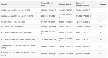 Die Preise für Porsche 911 Sondermodelle haben sich in den letzten Jahren teilweise erheblich nach oben entwickelt. Die folgenden Angaben reflektieren den Marktstand zum Zeitpunkt der Erstellung dieser Kaufberatung (2023/2024) und können je nach Marktlage und individueller Objektqualität variieren.