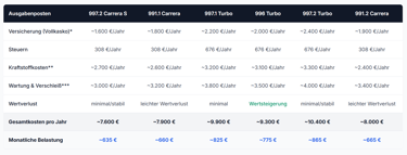 Antwort: Der 997.2 Carrera S und 991.1 Carrera haben tendenziell geringere Unterhaltskosten als die Turbo-Modelle. Der 991.2 ist durch seine Effizienz bei den Kraftstoffkosten günstiger.