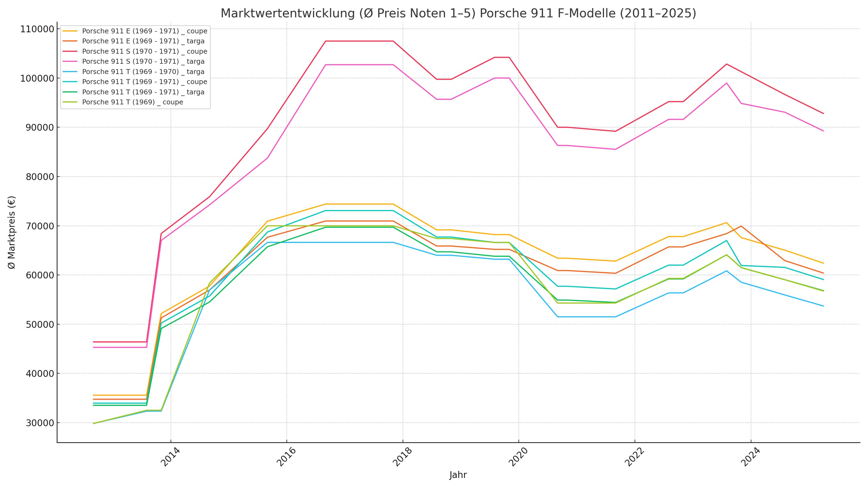 Die obige Grafik zeigt deutlich die Wertentwicklung der verschiedenen Modellvarianten über die Jahre 2011 bis 2025. Besonders auffällig ist der stetig ansteigende Trend, wobei die S-Modelle die stärkste Wertsteigerung verzeichnen. Die aktuellen Daten (Stand April 2025) zeigen, dass der 911 S 2.2 Coupé mit 109.880 € und der 911 S 2.2 Targa mit 105.850 € die höchsten Durchschnittspreise erreichen.