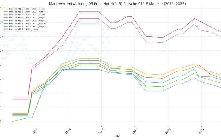 Die umfassende Analyse der Preisverläufe aller Porsche 911 F-Modell-Varianten (T, E, S – Coupé & Targa) über einen Zeitraum von mehr als 13 Jahren zeigt fünf zentrale Trends: