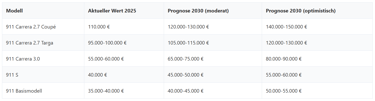 Vorsicht bei kurzfristigen Investments: Die Preisvolatilität, insbesondere bei hochpreisigen Modellen wie dem Carrera 2.7, sollte zu einer vorsichtigen Einschätzung kurzfristiger Renditeerwartungen führen.
