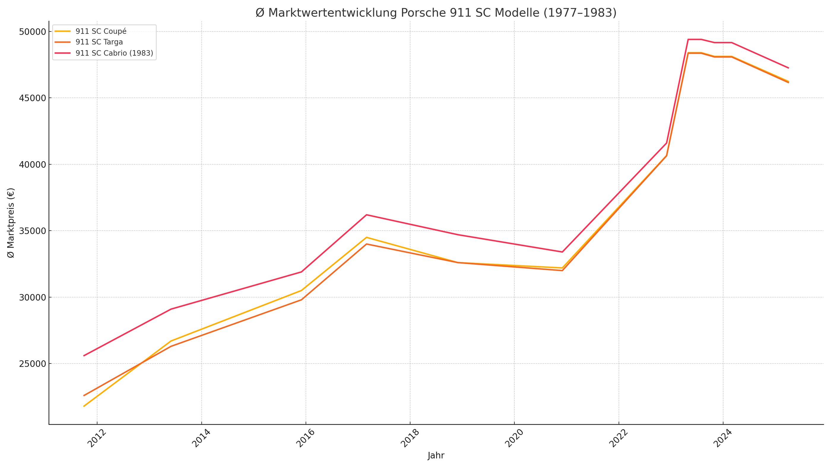 Der Porsche 911 SC (1977-1983) bleibt ein wichtiger Meilenstein in der Geschichte des 911 und ein beliebtes Sammlerobjekt, jedoch mit deutlich niedrigeren Marktwerten als bisher angenommen. Die aktuelle Preisentwicklungsgrafik zeigt einen volatileren Markt mit moderateren Wertsteigerungen als zuvor dargestellt.