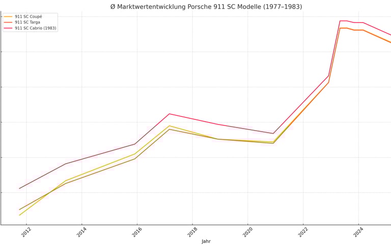 Die aktuelle Preisentwicklungsgrafik zeigt einen differenzierten Verlauf der Marktwerte von Porsche 911 SC-Modellen mit klar erkennbaren Phasen des Anstiegs, der Stagnation und jüngst einer Volatilität. Besonders auffällig ist der dramatische Preissprung zwischen 2022 und 2023, gefolgt von einem leichten Rückgang bis 2025.