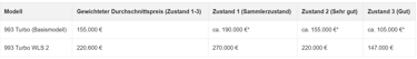 Die aktuellen Durchschnittspreise für die verschiedenen 993 Turbo-Varianten stellen sich wie folgt dar: