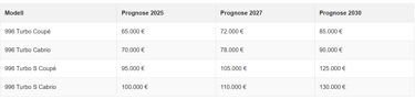 Fortsetzung des aktuellen Trends: Die moderate bis starke Wertsteigerung der letzten Jahre wird sich voraussichtlich fortsetzen, wobei die Seltenheit des Turbo S zu einer überproportionalen Entwicklung führen dürfte.